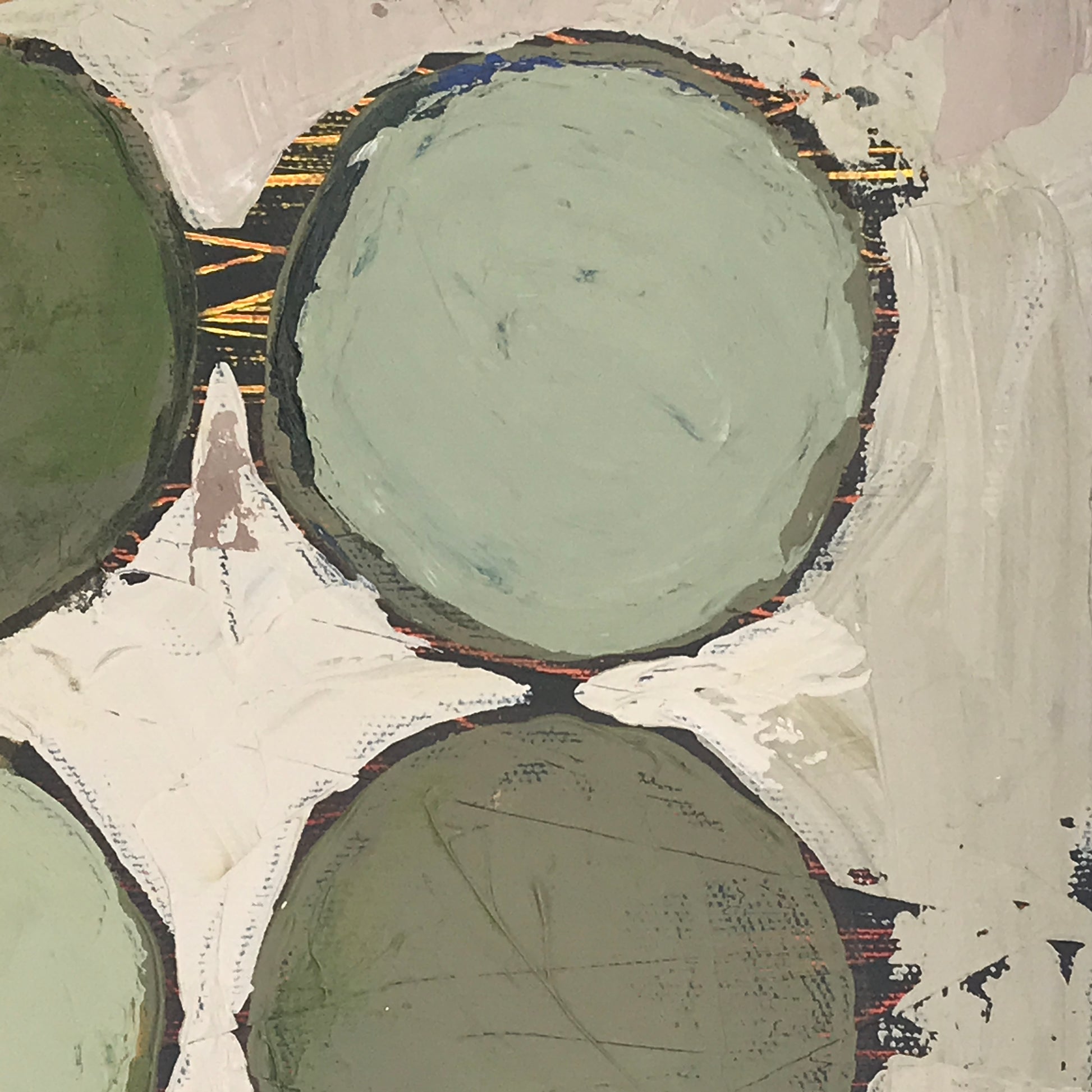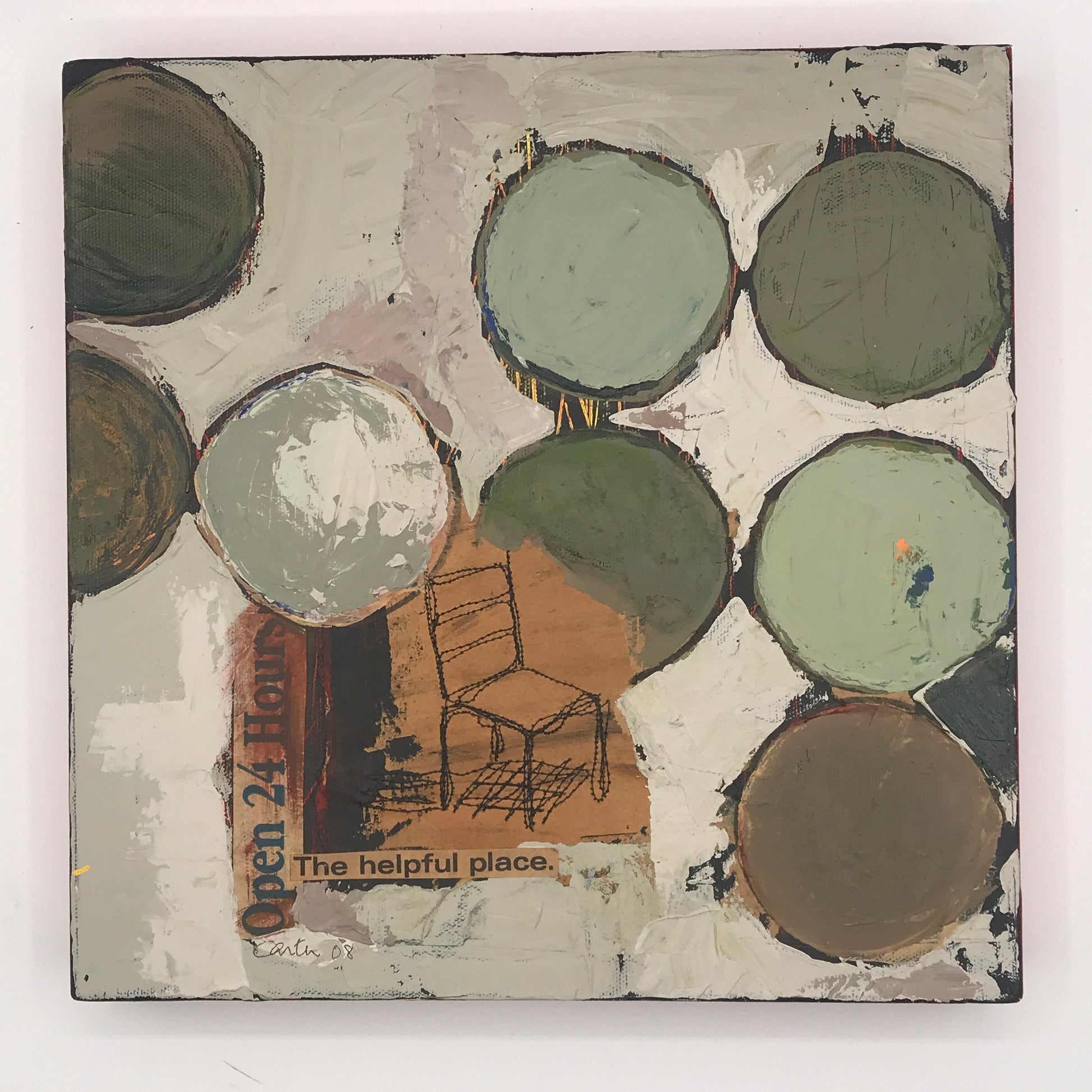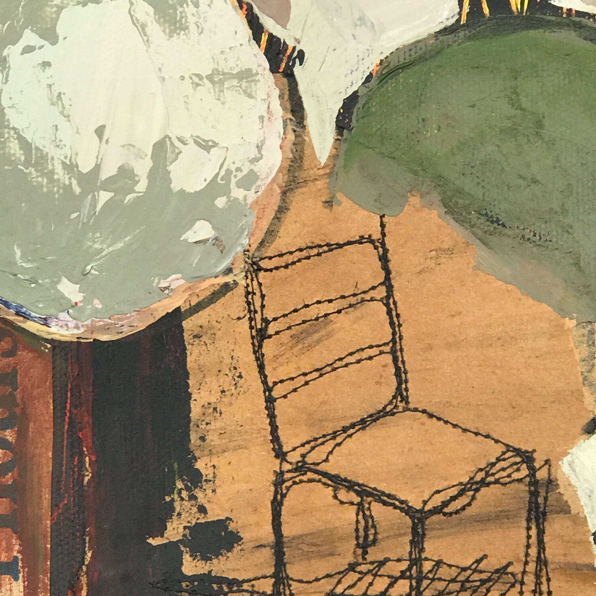 Layering. Start with reds and yellows on black that barely peep through the earthy green circles. The circles are inspired by the airplane view of farmland, where some watering systems create circles of color. Two lines of text are cut from paper bags, and the chair is stitched onto another section of paper bag.