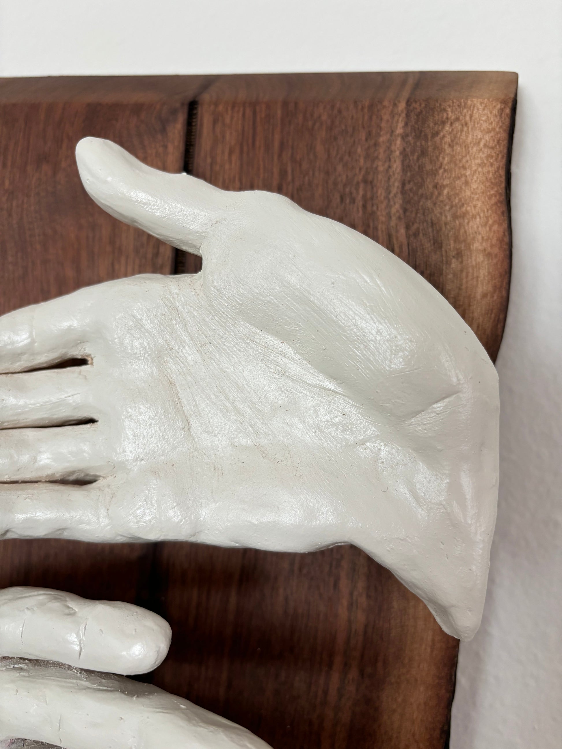 The plain white hands on a natural walnut background are striking, and since each hand is individually sculpted using a professional hand model (just kidding, I use my own unprofessional hands as models), each hand is unique.
