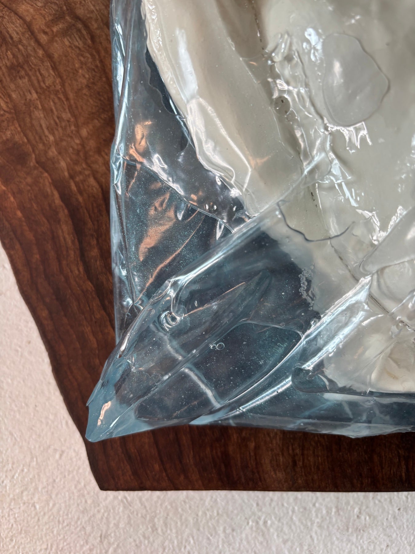 This piece evolved as I was making it: I glazed the hands and face, and then painted over that, then put the hands and face into a large plastic bag and poured in pale blue resin. Then I attached the whole thing to a wooden slab that I just loved, with its story of trunk and branches. And then, because why would I be done? I cut off the plastic bag and left the resin, with its readable shapes that show how it was formed.