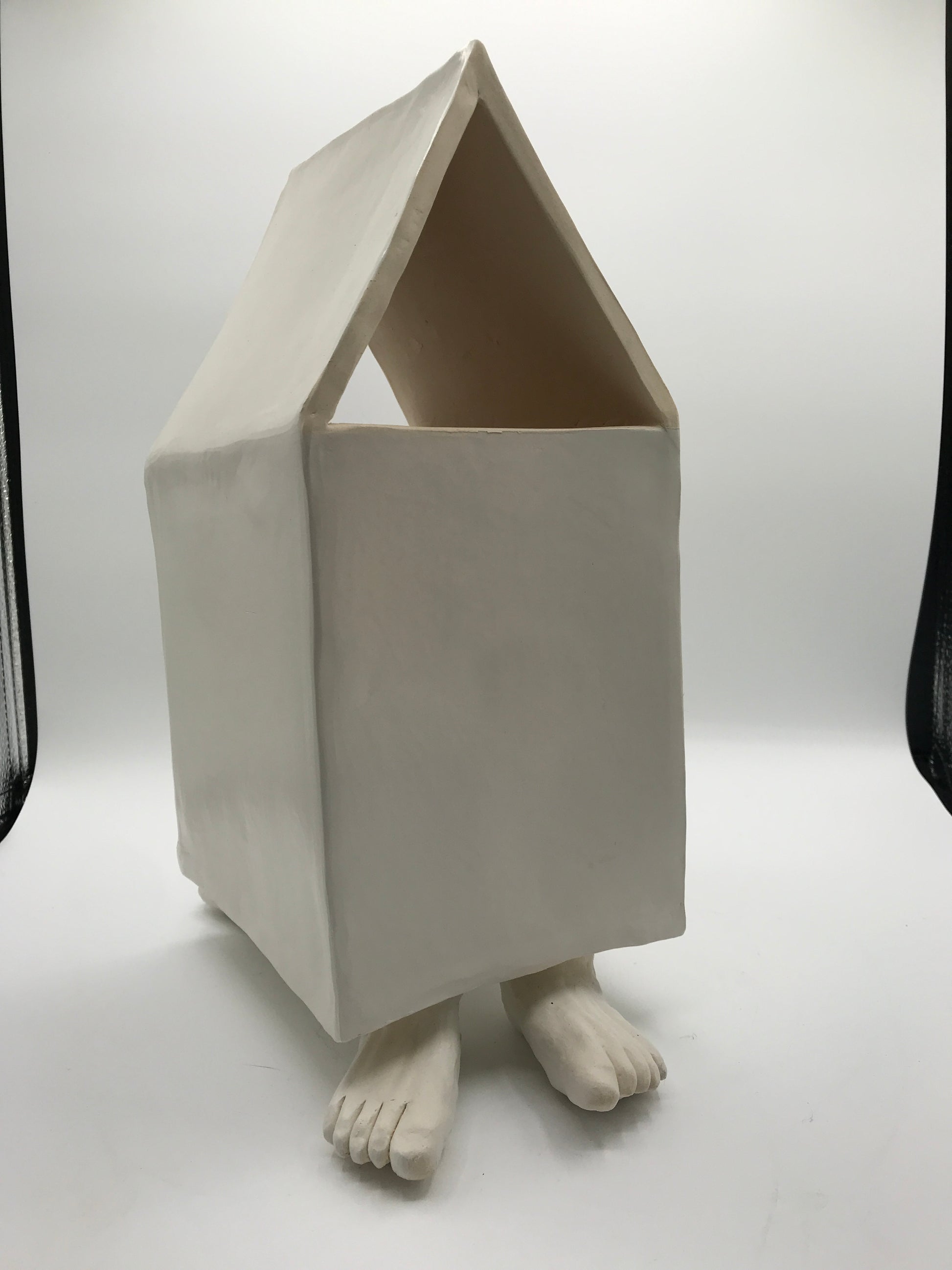 This painted clay sculpture measures 11.5 inches wide, 14 inches high, and 5 inches deep.
