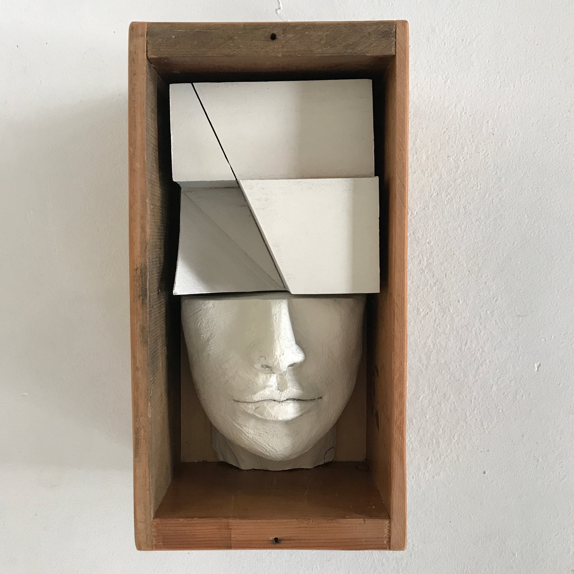 Juxtaposition. Contrast of shapes and materials. Minimal color. This quiet piece has a ceramic face topped with a wooden block shaped with abstract cuts. I cut it on a bandsaw years ago and it was part of another piece that I decided to repurpose. I can't even tell how I did this cutting--it shouldn't work! It fit just right above the face and into the box, so here we are.