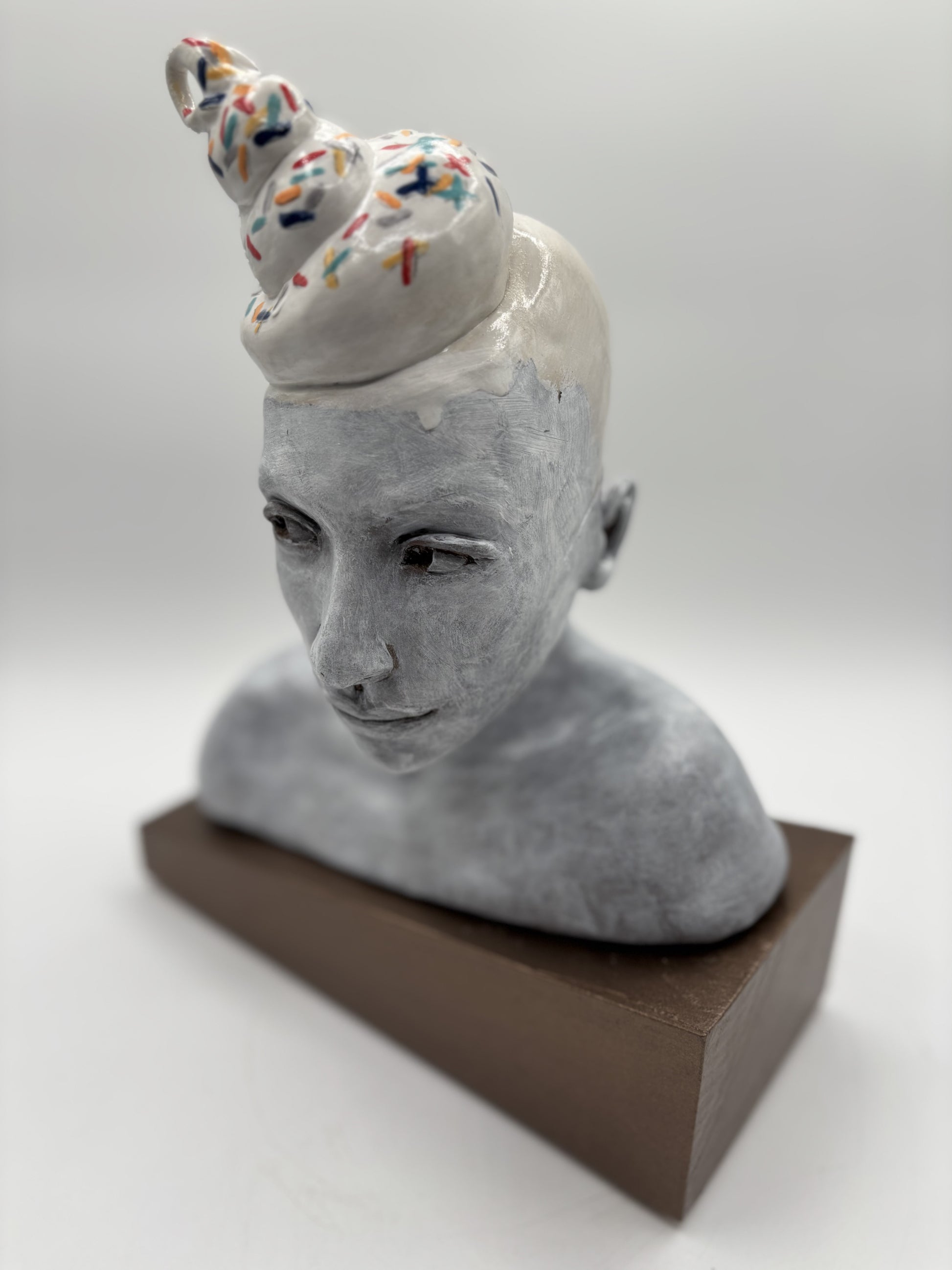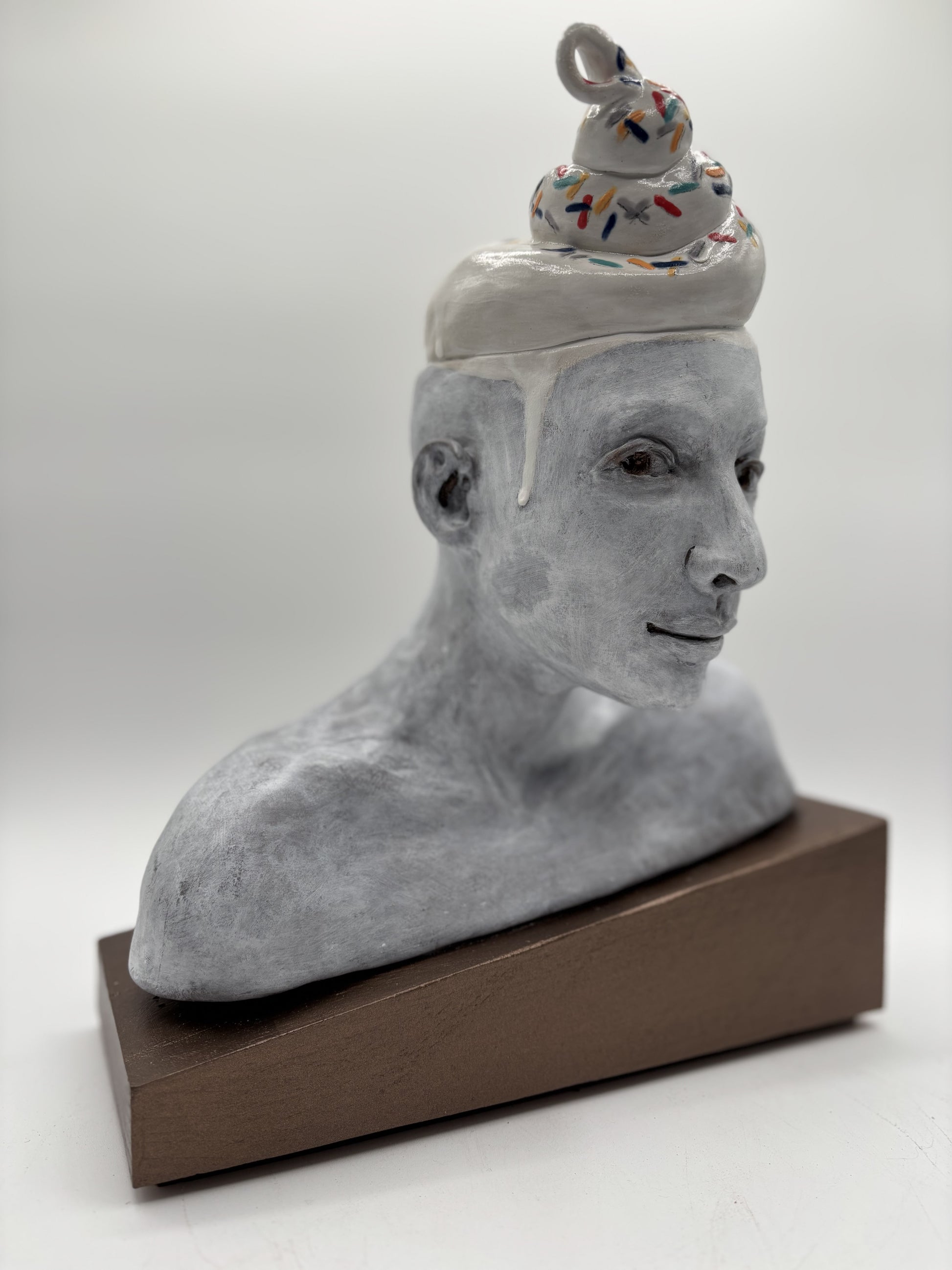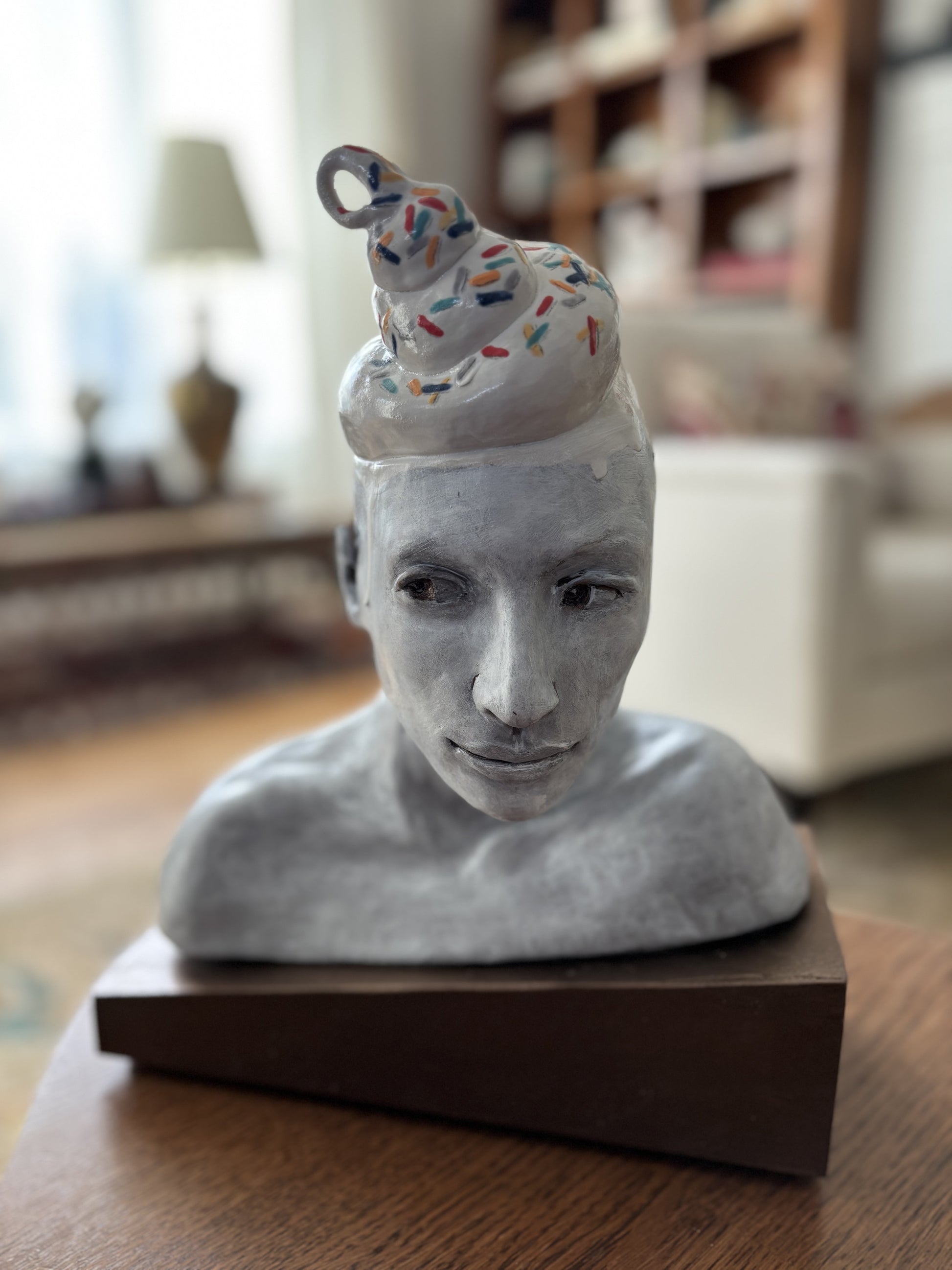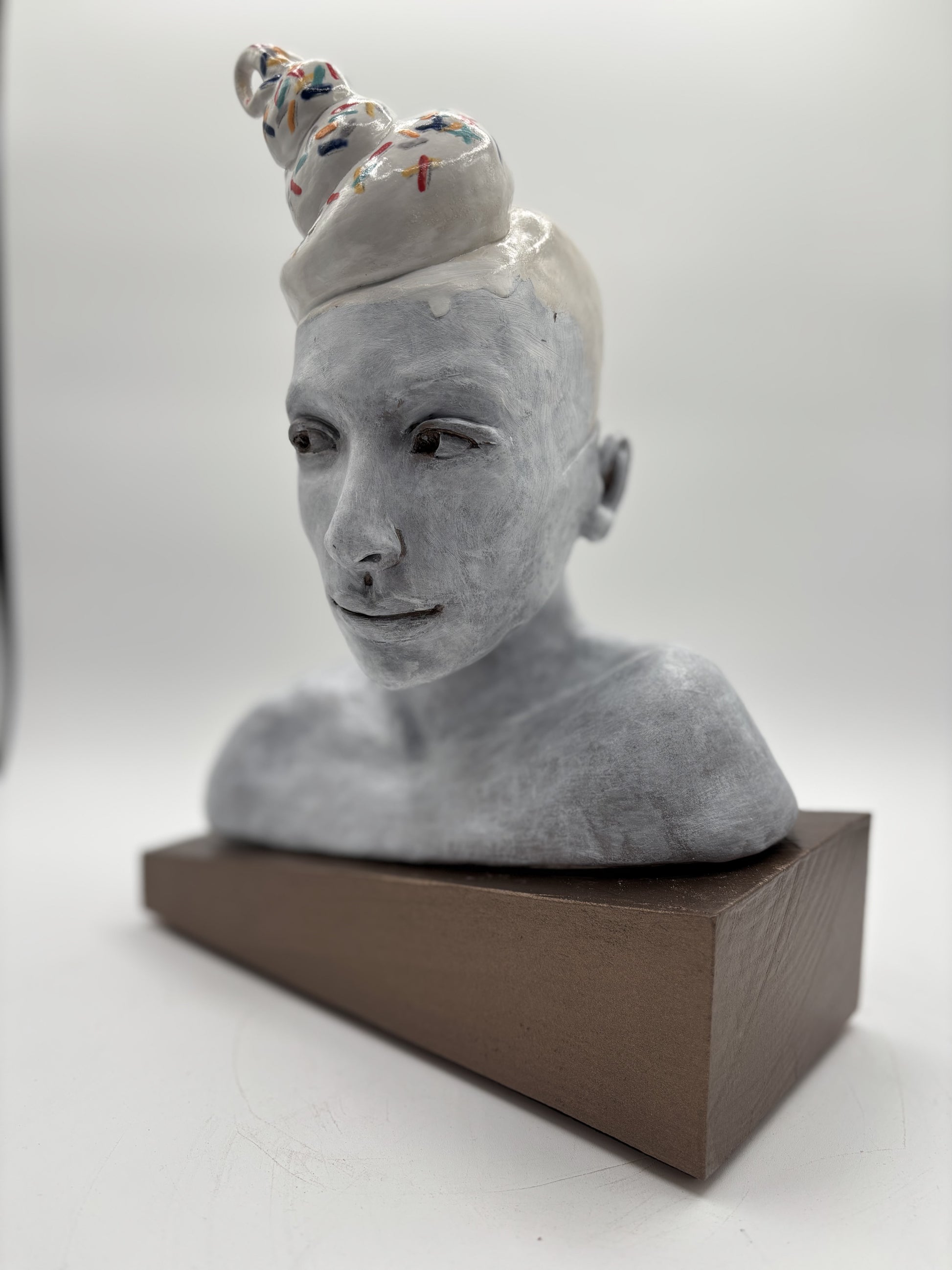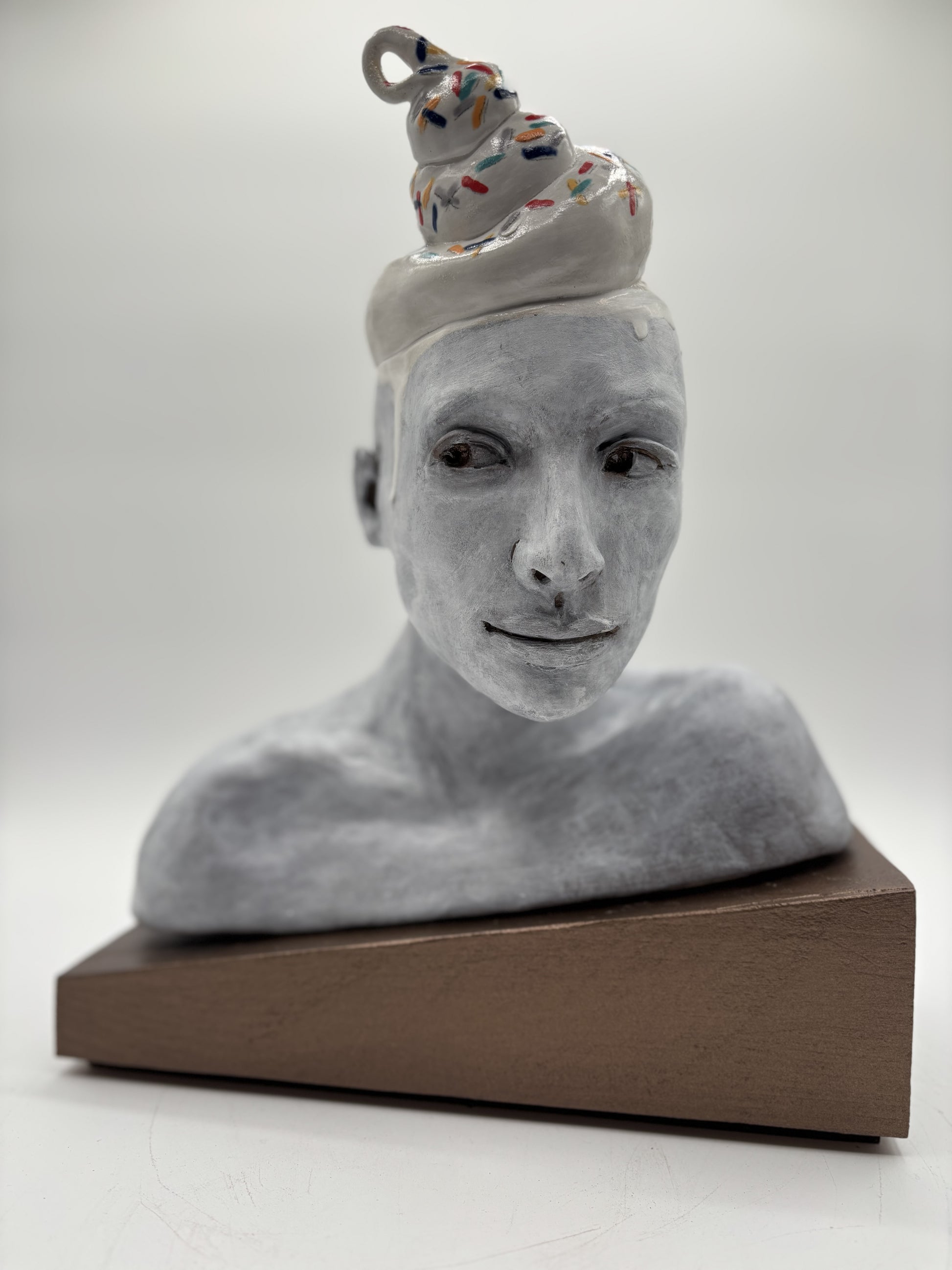 This is what happens when adults let themselves play. As I've been making busts, I found that I enjoy fooling around with putting things other than hair on people's heads: nests, geometric shapes, leaves, spikes. Now we can add ice cream to that list.