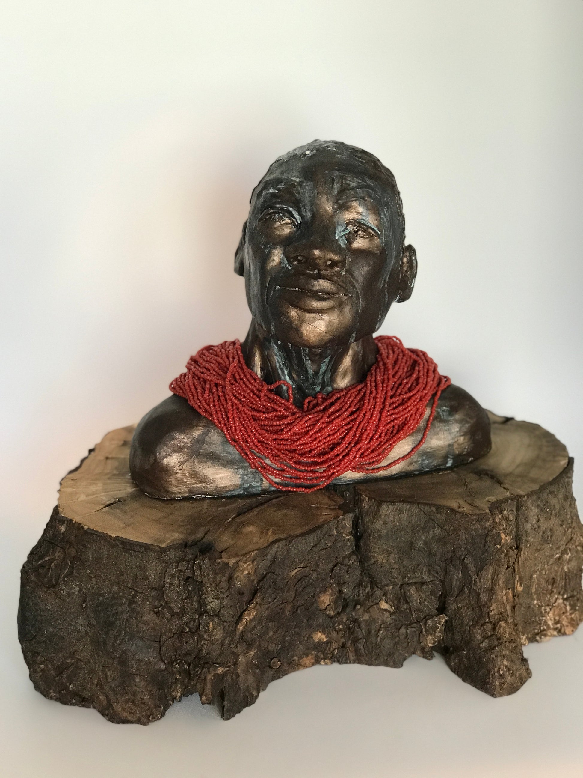 Here is one of seven pieces that show black faces. The necklace is one collected by my mom on her global travels; I assume it is made of coral. It's not attached to the sculpture.