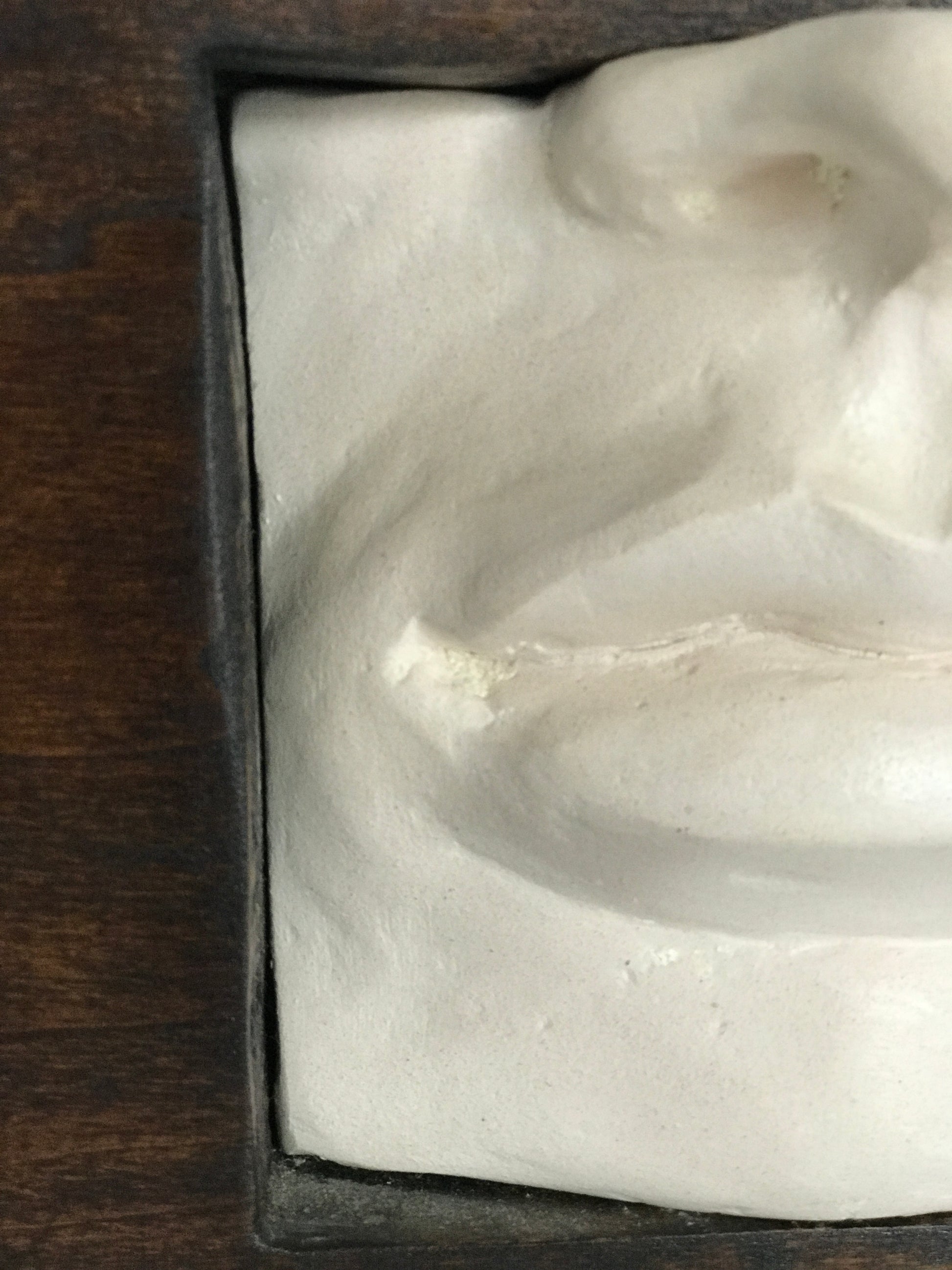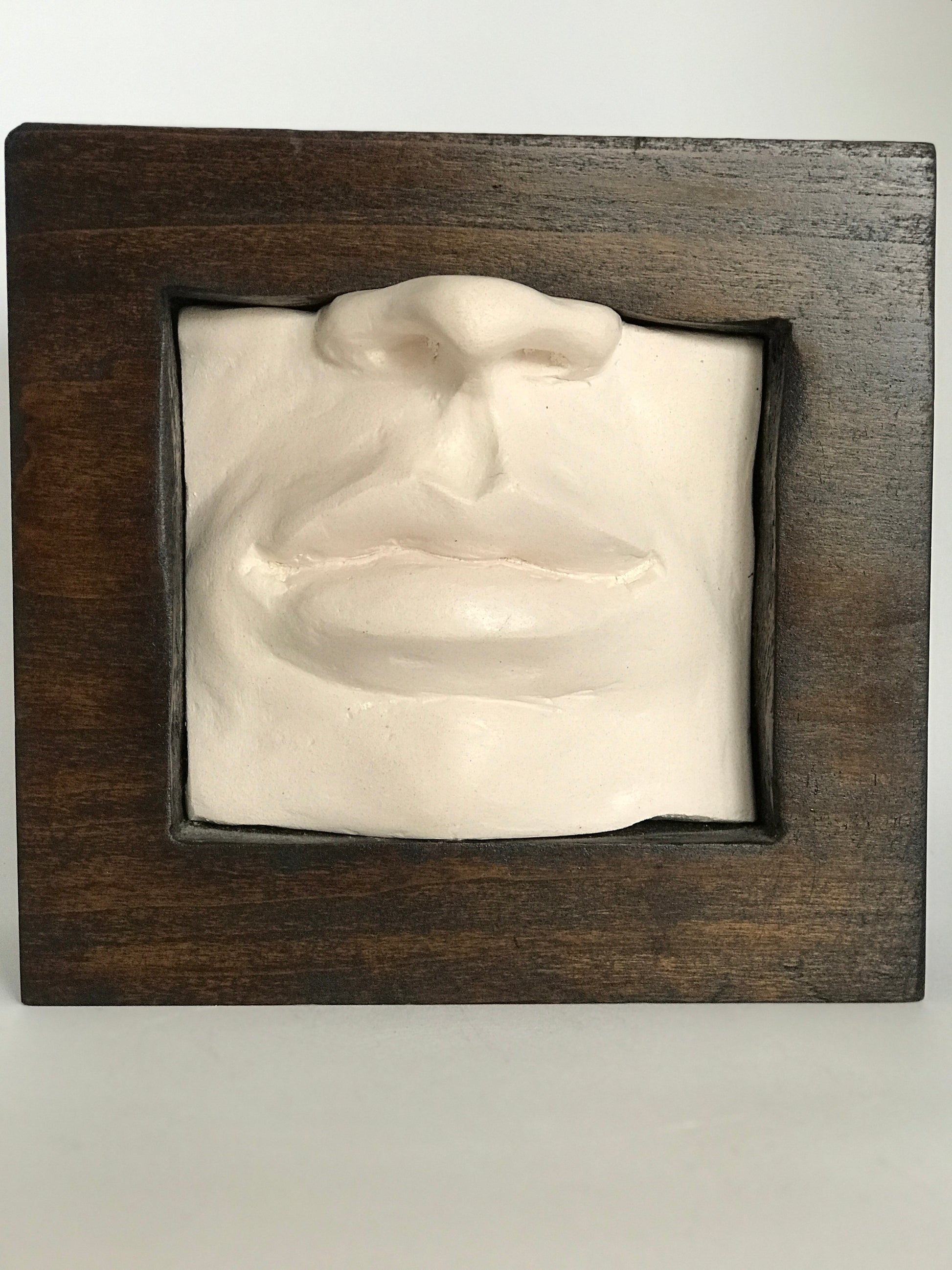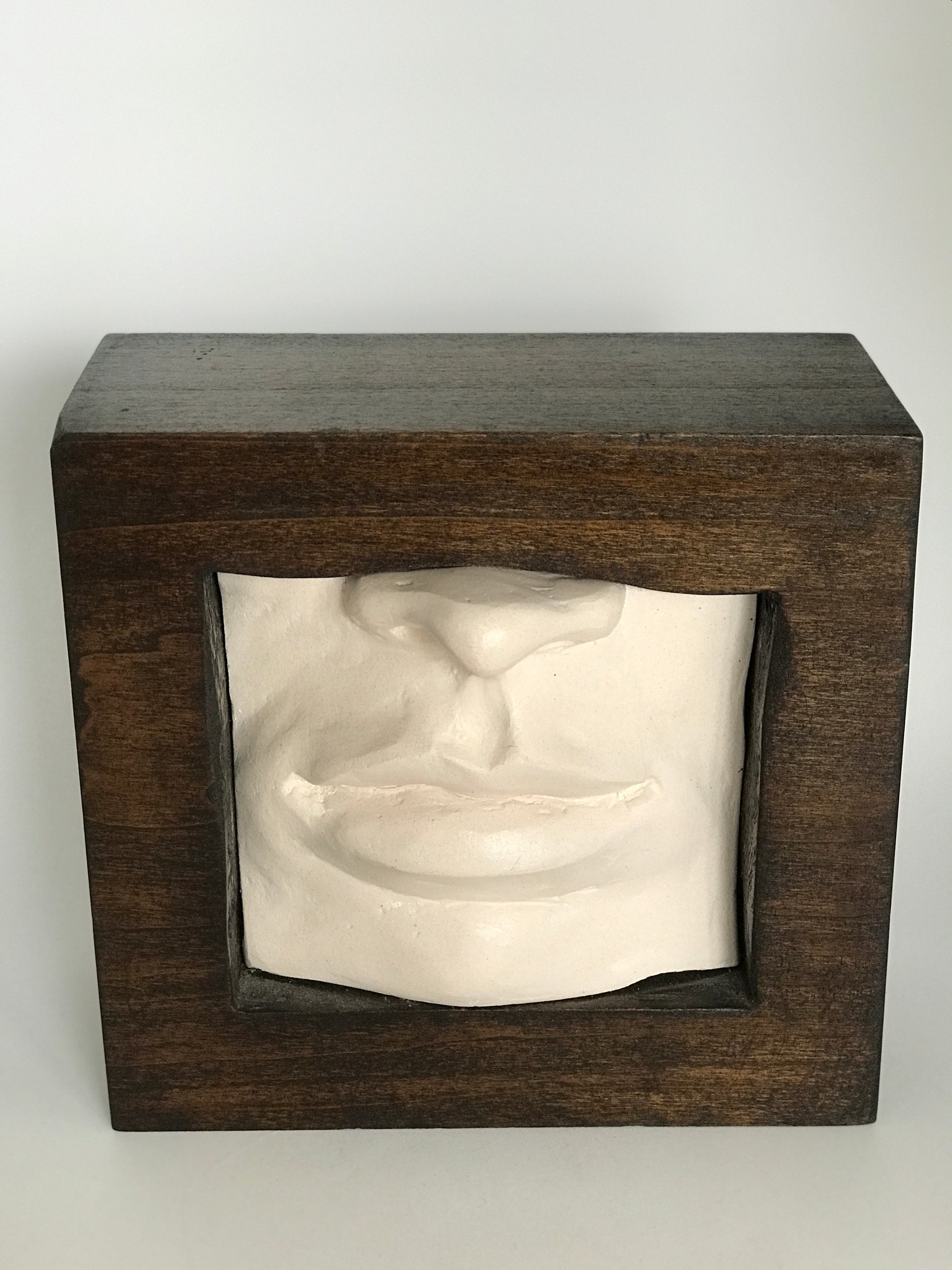 I love the face. (And hands, and animals, and the human body--okay, there are many things I'm interested in making.) This piece began early in my clay journey, when an Adult Ed class was looking for students to fill a clay portrait class. I joined in the second class, so I didn't know what we were supposed to be doing. There was a female model in the room and there were some fascinating larger-than-life bits of faces arranged on a black cloth on the floor. I was more interested in the bits of faces than the model, so I copied the mouth.