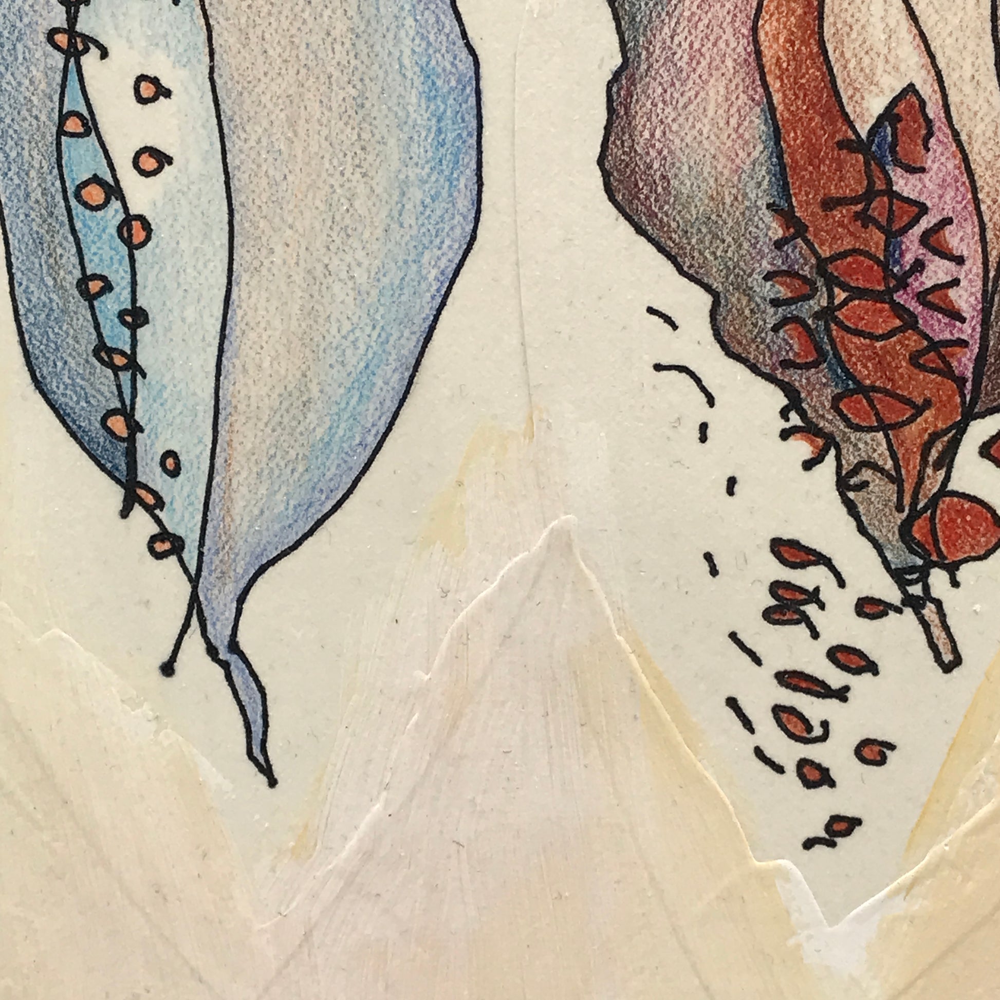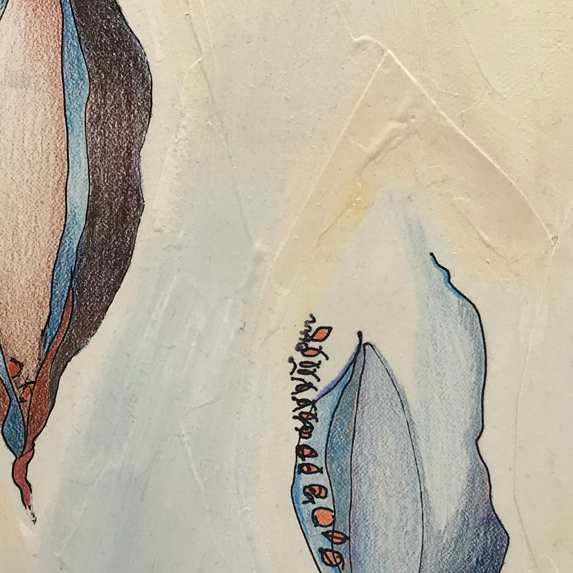 I was fascinated by the sort-of-accurate and sort-of-crazy results of my first drawing and didn't stop until the class moved on to the next exercise. When I got home I added colored pencil to the black and white drawings, cut them out of the notebook, and then laid them on red fabric and other backgrounds. I finally settled on a subdued painted background that echoed some of the colors in the drawings.