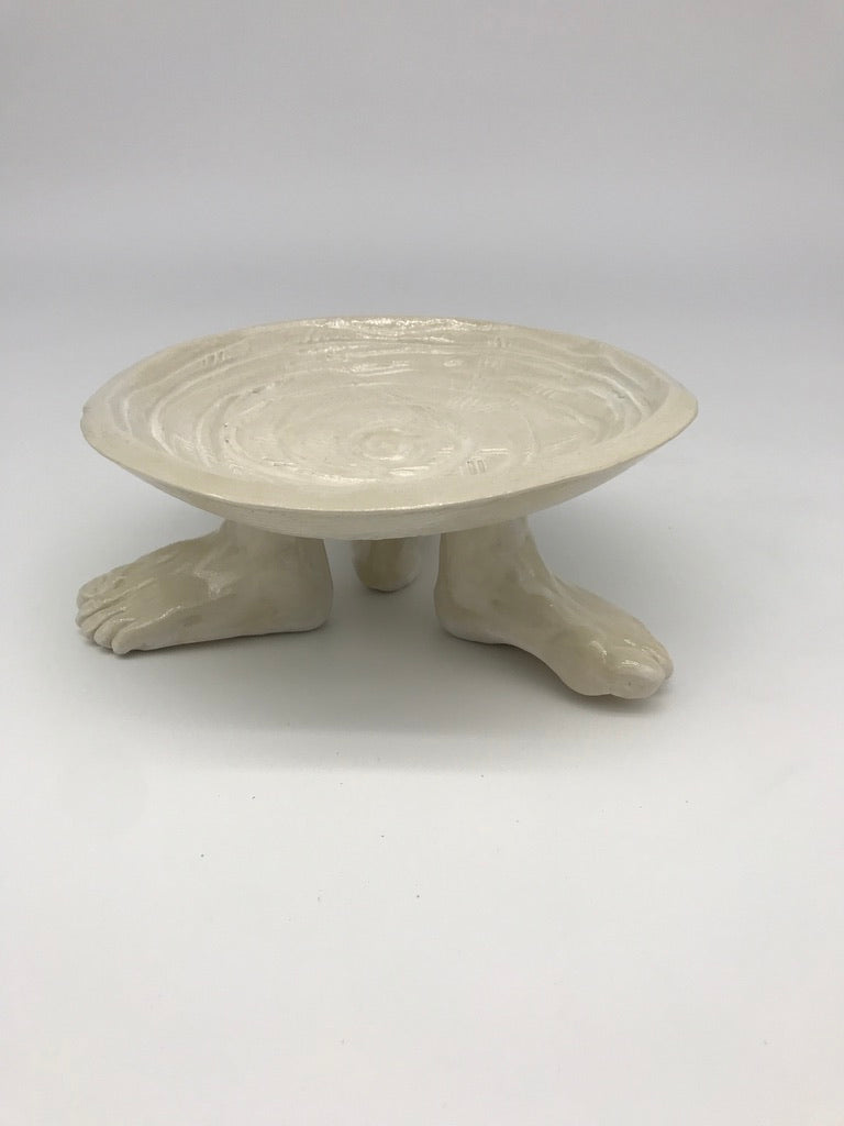 I have made several of these footed bowls and each one is different, made completely by hand without using molds. As someone who loves word play, it amuses me to call them footed bowls because bowls that are thrown on the wheel usually have a small ring on the bottom to hold the bowl steady. That ring is called a foot. A footed bowl in my world means a bowl with feet.