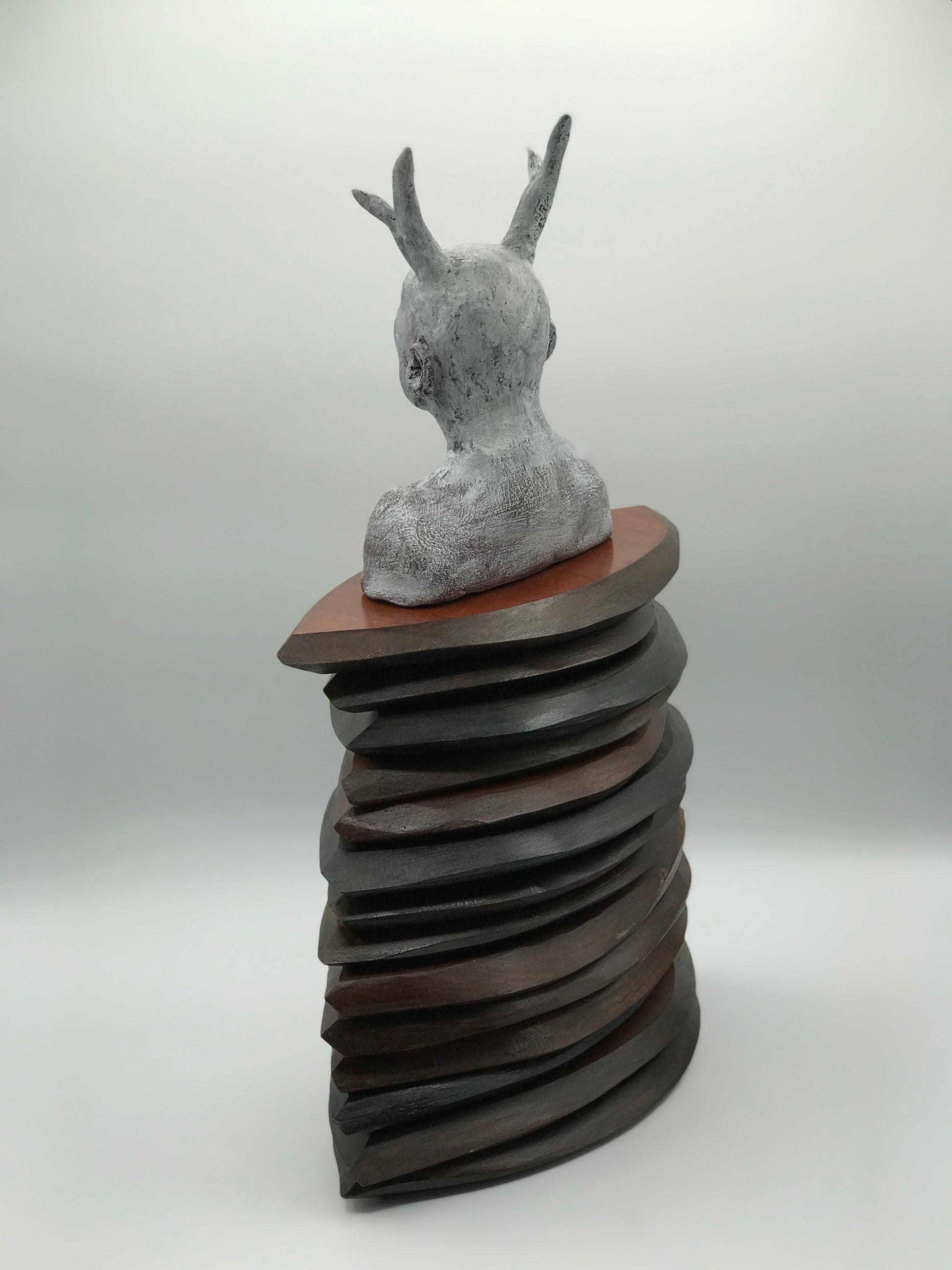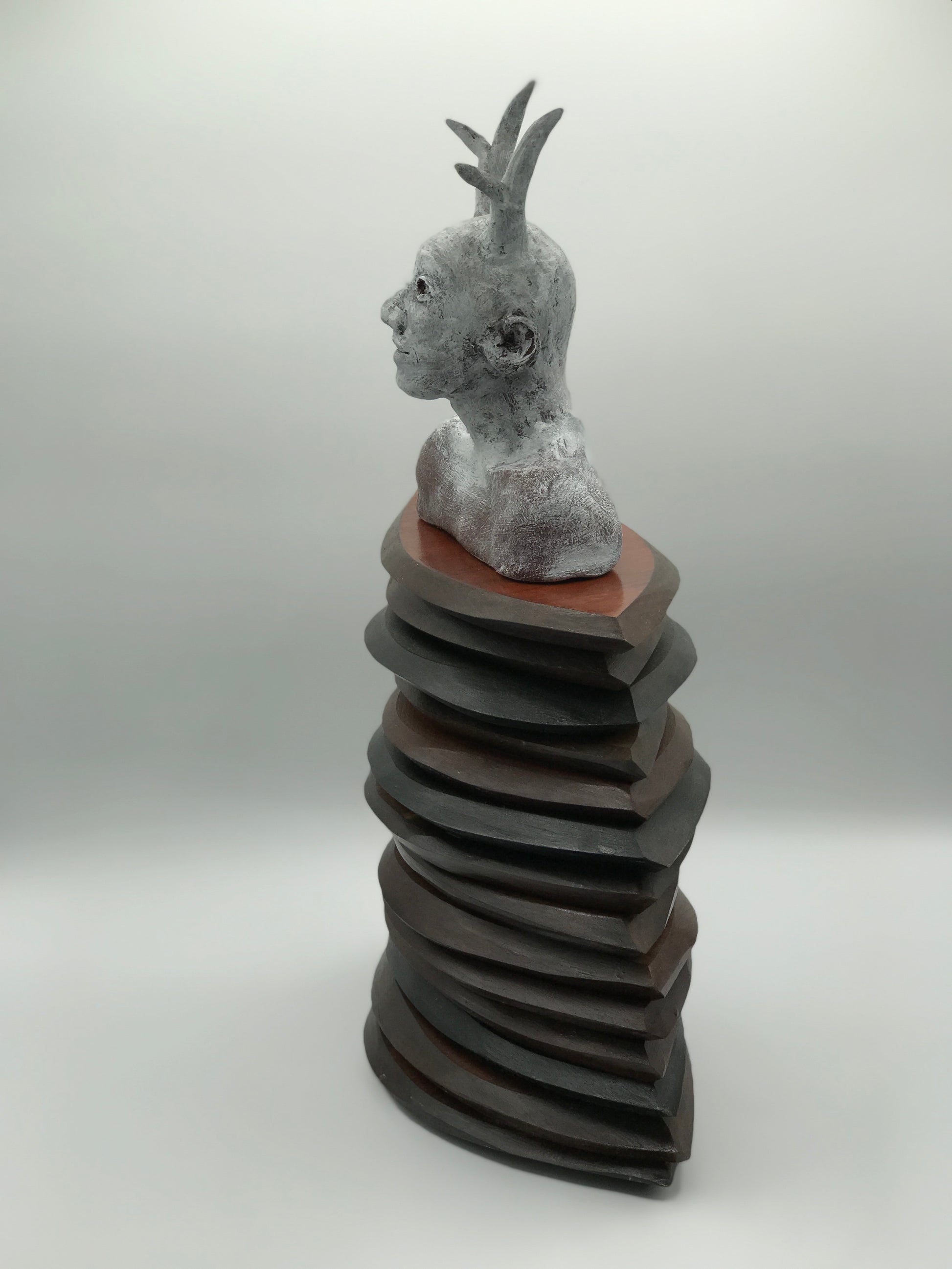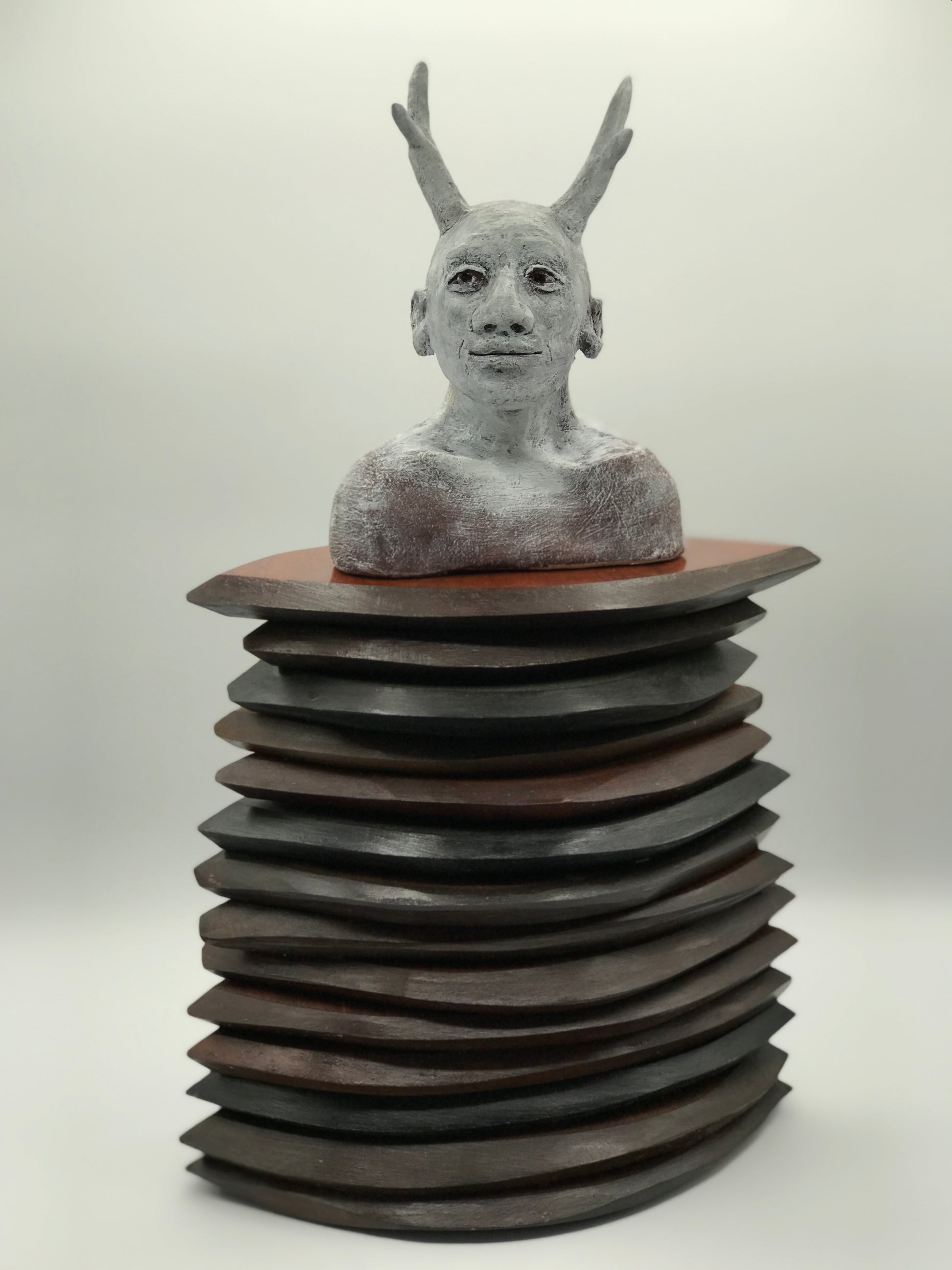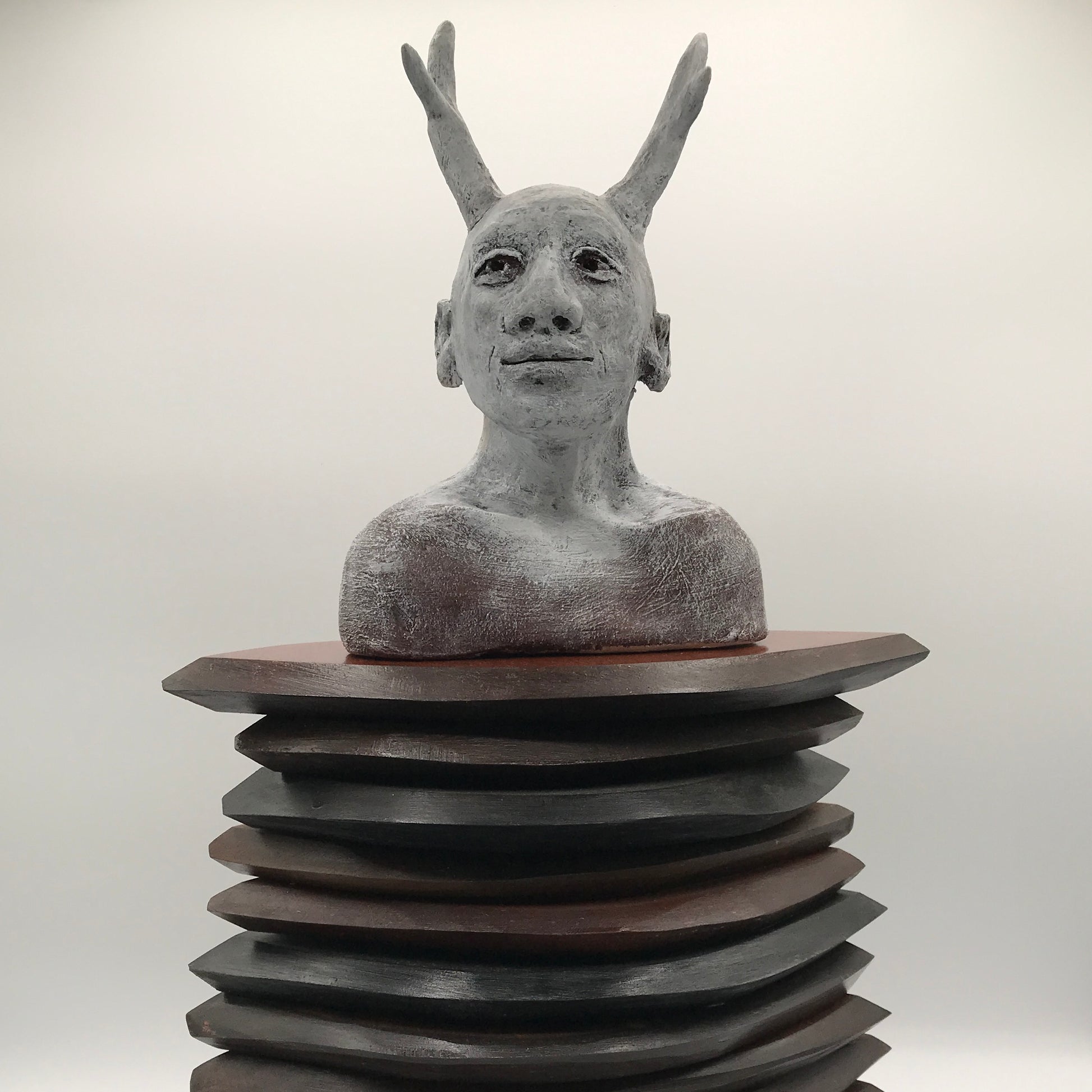 When Covid shut down the figure sculpture class I was in, I ended up alone* at the kitchen table, without a model. I'd been envisioning-and making-pieces where people grew horns and wooden geometric nests held eggs. This was my first piece where I created a person budding like a flower.