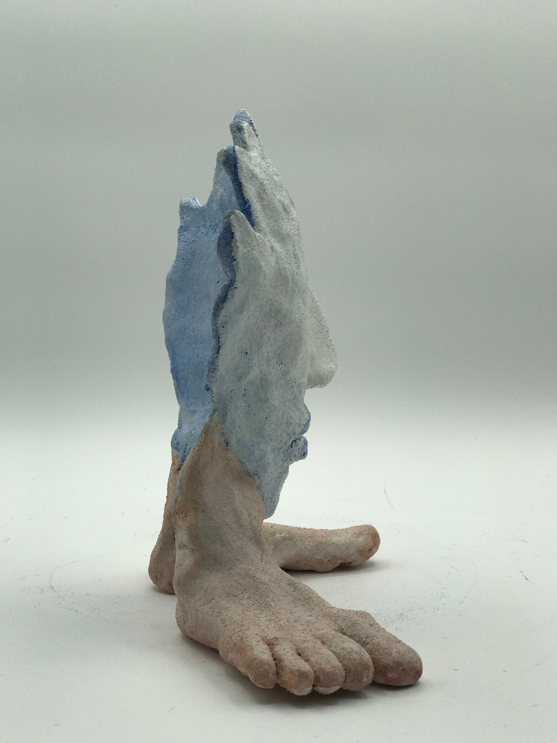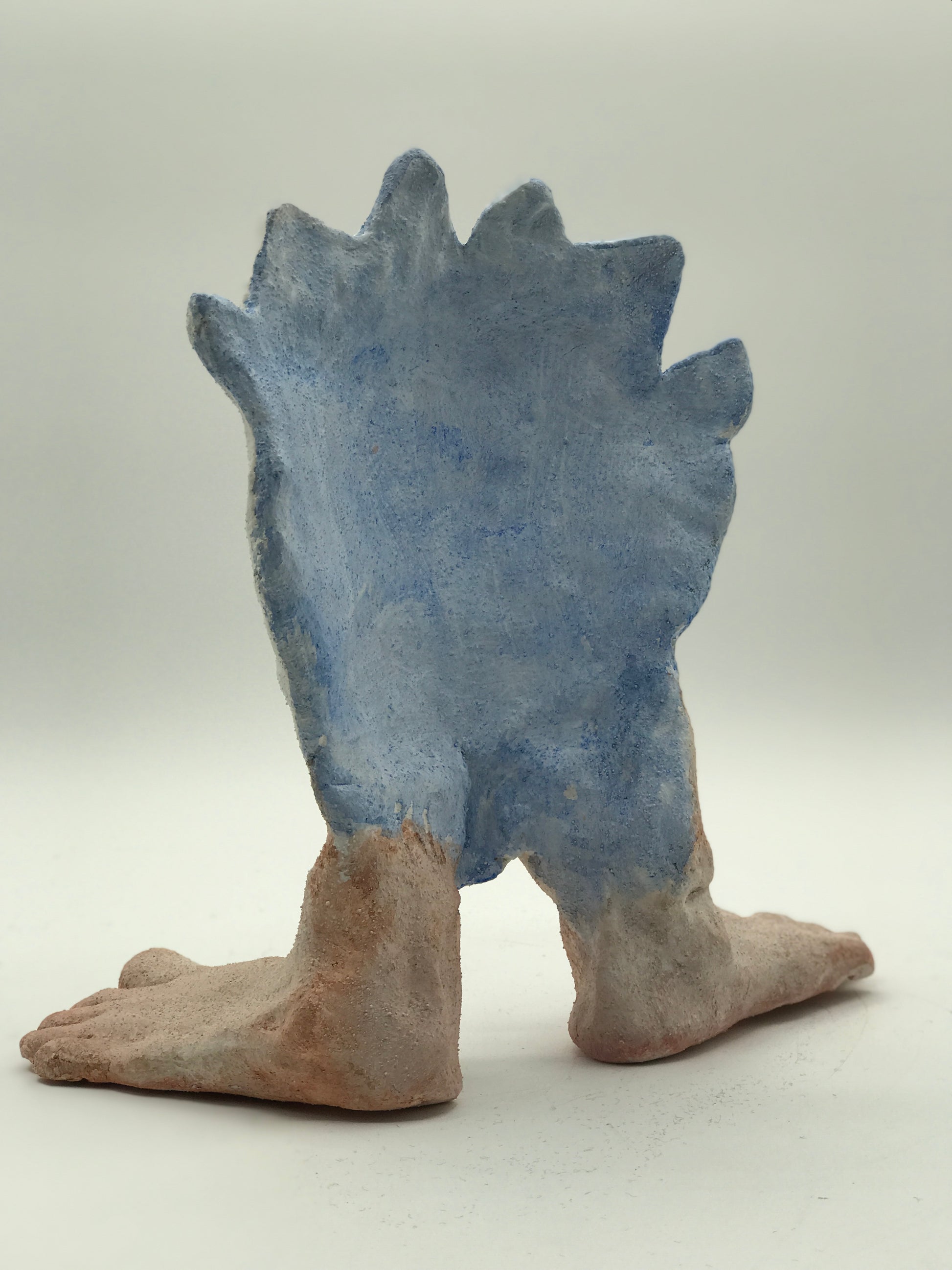He's made of clay with a lot of grog so he's textured. Grog is fired clay that's broken up into tiny pieces (smaller than the head of a pin) and put into raw clay to add firmness.
